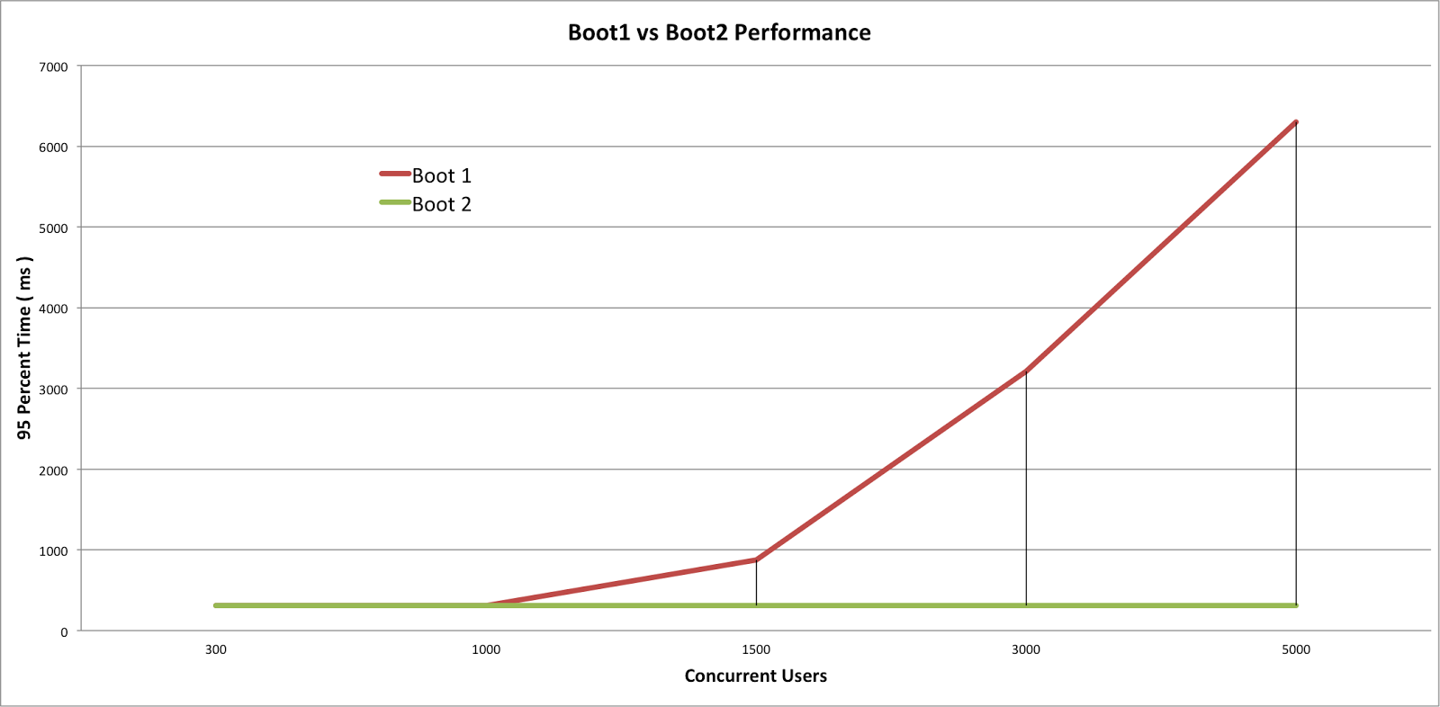 위 그림은 DZone 게시글 중 하나인 Spring WebFlux를 이용한 Boot2와 Spring MVC를 이용한 Boot1을 비교한 그래프이다.