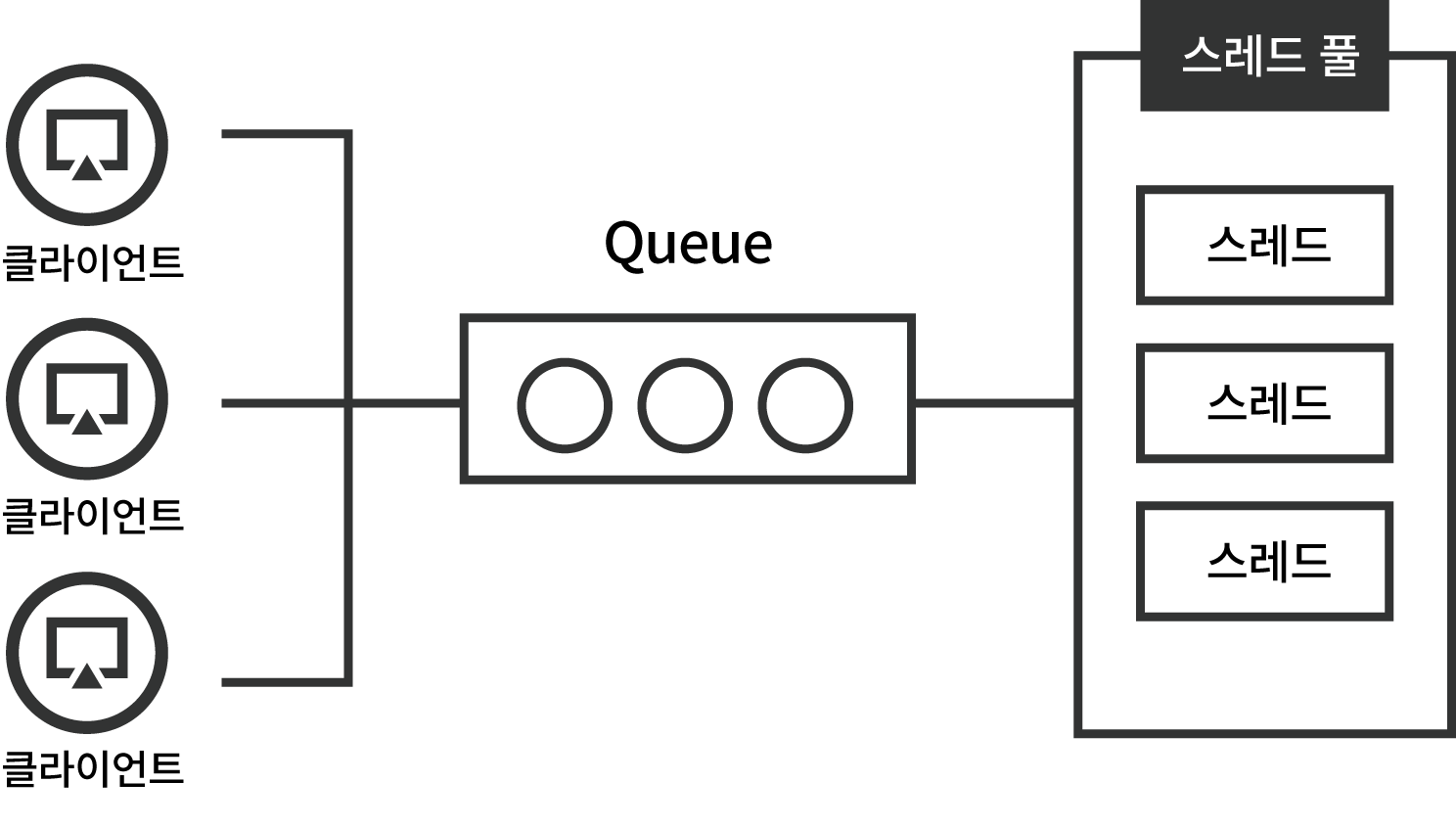 위 그림처럼 유저들로부터 HTTP 요청이 들어올 때 요청들은 Queue를 통하게 된다. Thread pool이 수용할 수 있는 수(thread pool size)의 요청까지만 동시적으로 작업이 처리되고 만약 넘게 된다면 큐에서 대기하게 된다. 즉 하나의 요청은 하나의 Thread를 요구한다. (one request per thread model)
